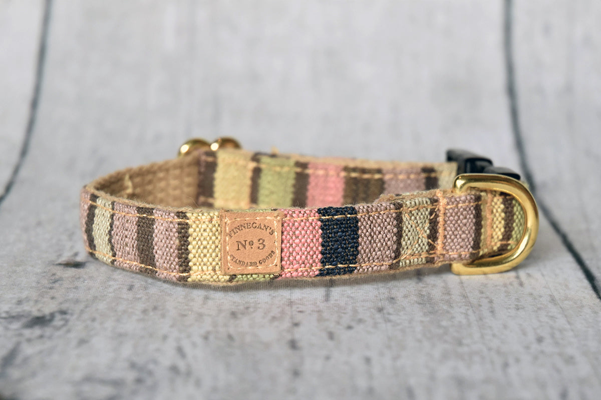 All of our accessories are made on lightweight soft cotton webbing. We use different fabrications, sourced from all over the world, accompanied by solid brass fittings and an adjustable collar. All of our products are handmade and assembled in San Francisco, California.