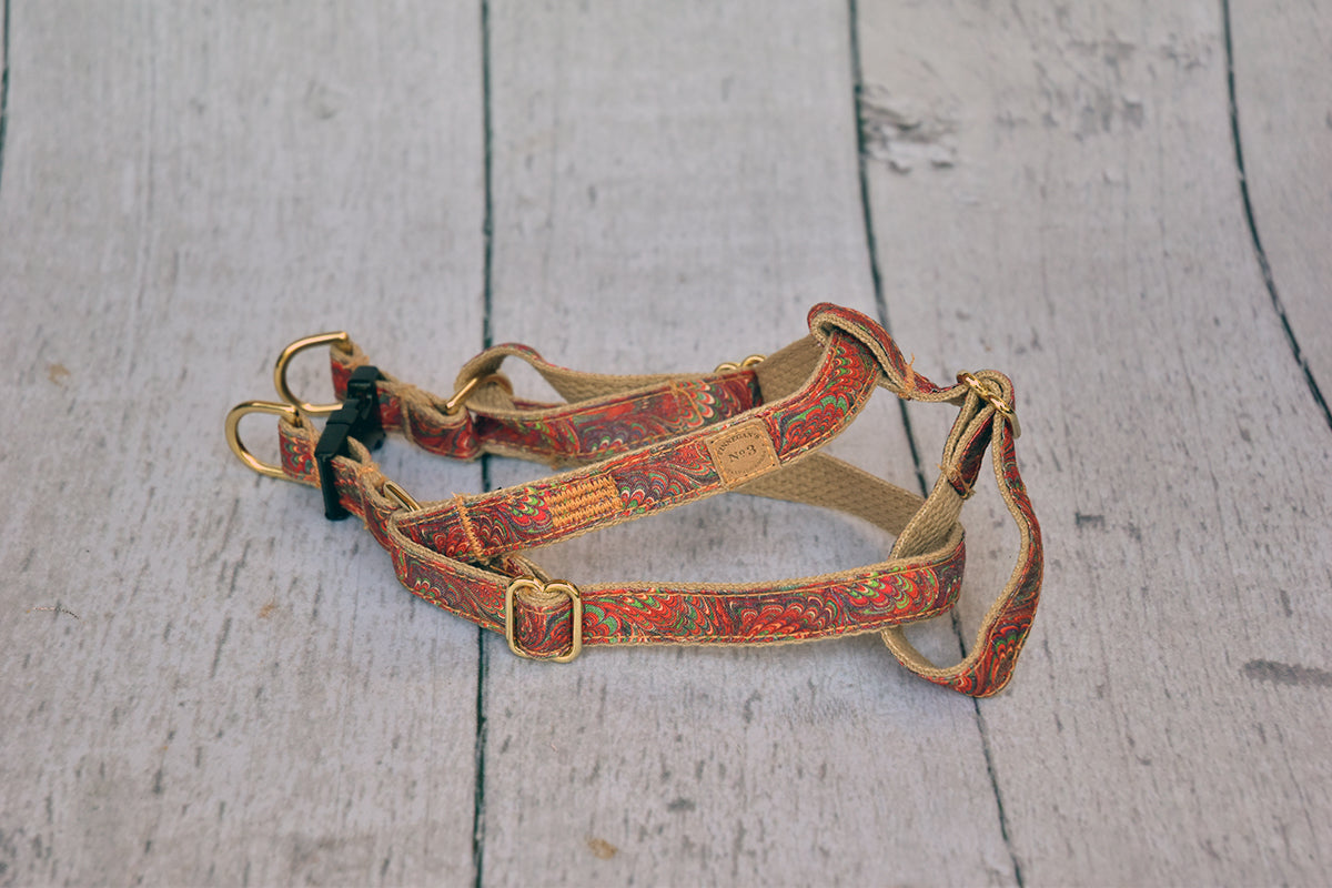 All of our accessories are made on lightweight soft cotton webbing. We use different fabrications, sourced from all over the world, accompanied by solid brass fittings and an adjustable collar. All of our products are handmade and assembled in San Francisco, California.