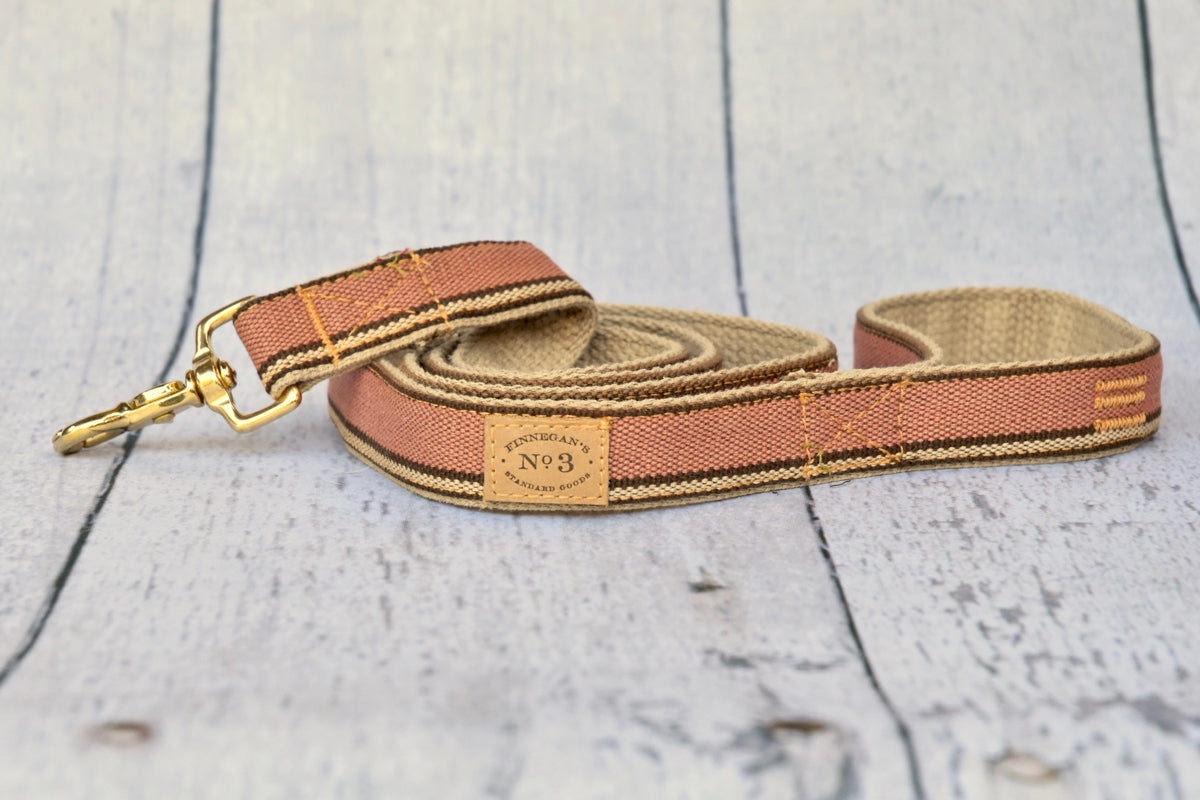 All of our accessories are made on lightweight soft cotton webbing. We use different fabrications, sourced from all over the world, accompanied by solid brass fittings and an adjustable collar. All of our products are handmade and assembled in San Francisco, California. Please note these leads are all one of a kind ! (just like your pup) Each one will have a little more pink or prown then the next!