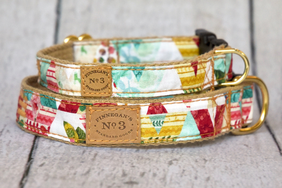 All of our accessories are made on lightweight soft cotton webbing. We use different fabrications, sourced from all over the world, accompanied by solid brass fittings and an adjustable collar. All of our products are handmade and assembled in San Francisco, California. Our 3/4 width collar is great for our smaller canine friends- or a larger breed puppy. Remember a matching leash because everyone loves to match! The small goes to an 11 inch neck and a medium to a 14 inch neck. – 5 foot leash