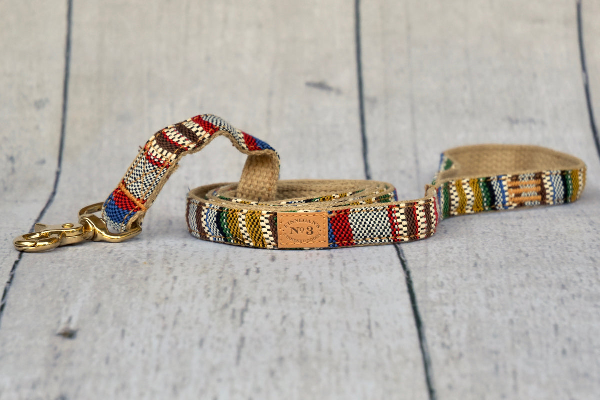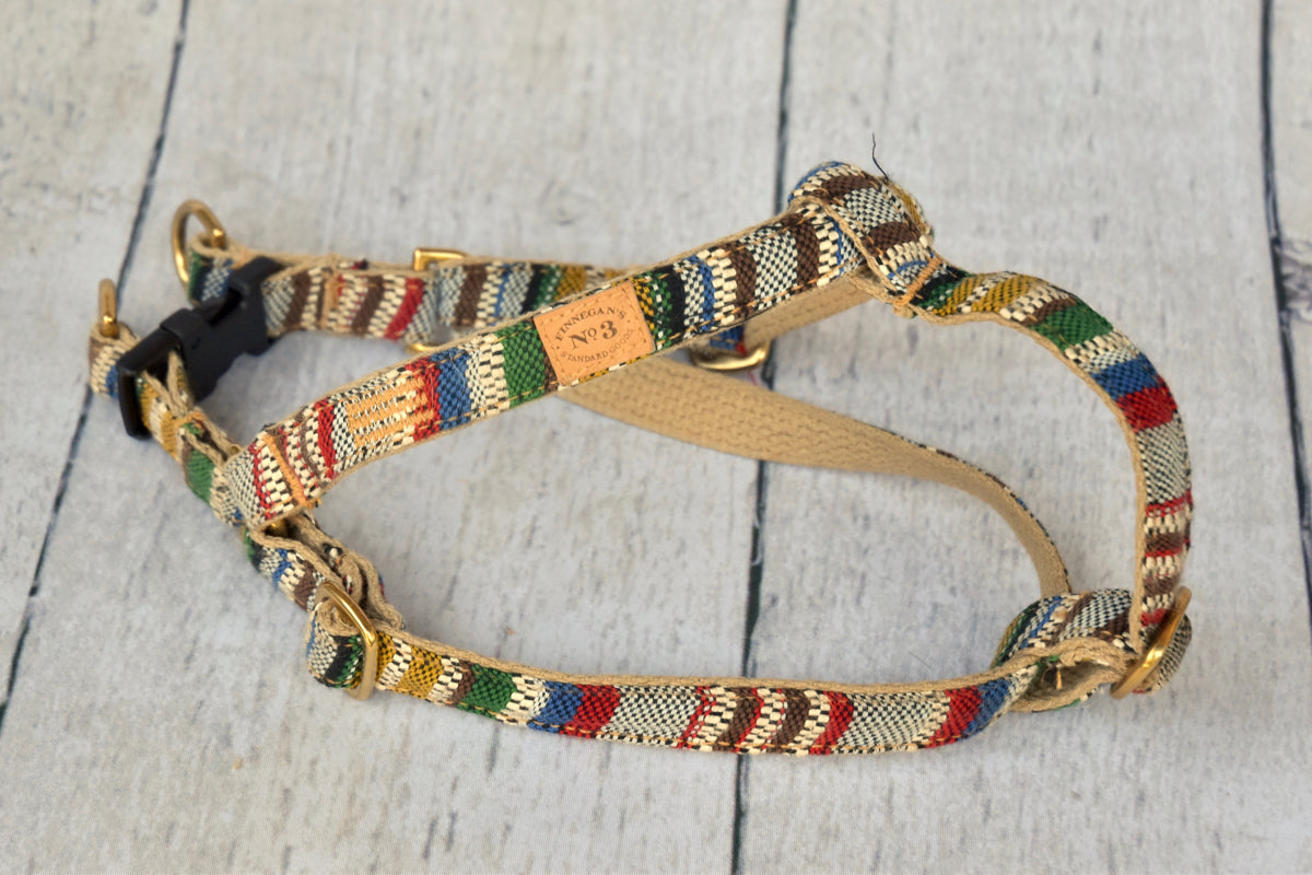 All of our accessories are made on lightweight soft cotton webbing. We use different fabrications, sourced from all over the world, accompanied by solid brass fittings and an adjustable collar. All of our products are handmade and assembled in San Francisco, California. Our 3/4 width collar is great for our smaller canine friends- or a larger breed puppy. Remember a matching leash because everyone loves to match! The small goes to an 11 inch neck and a medium to a 14 inch neck. – 5 foot leash