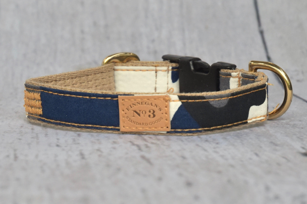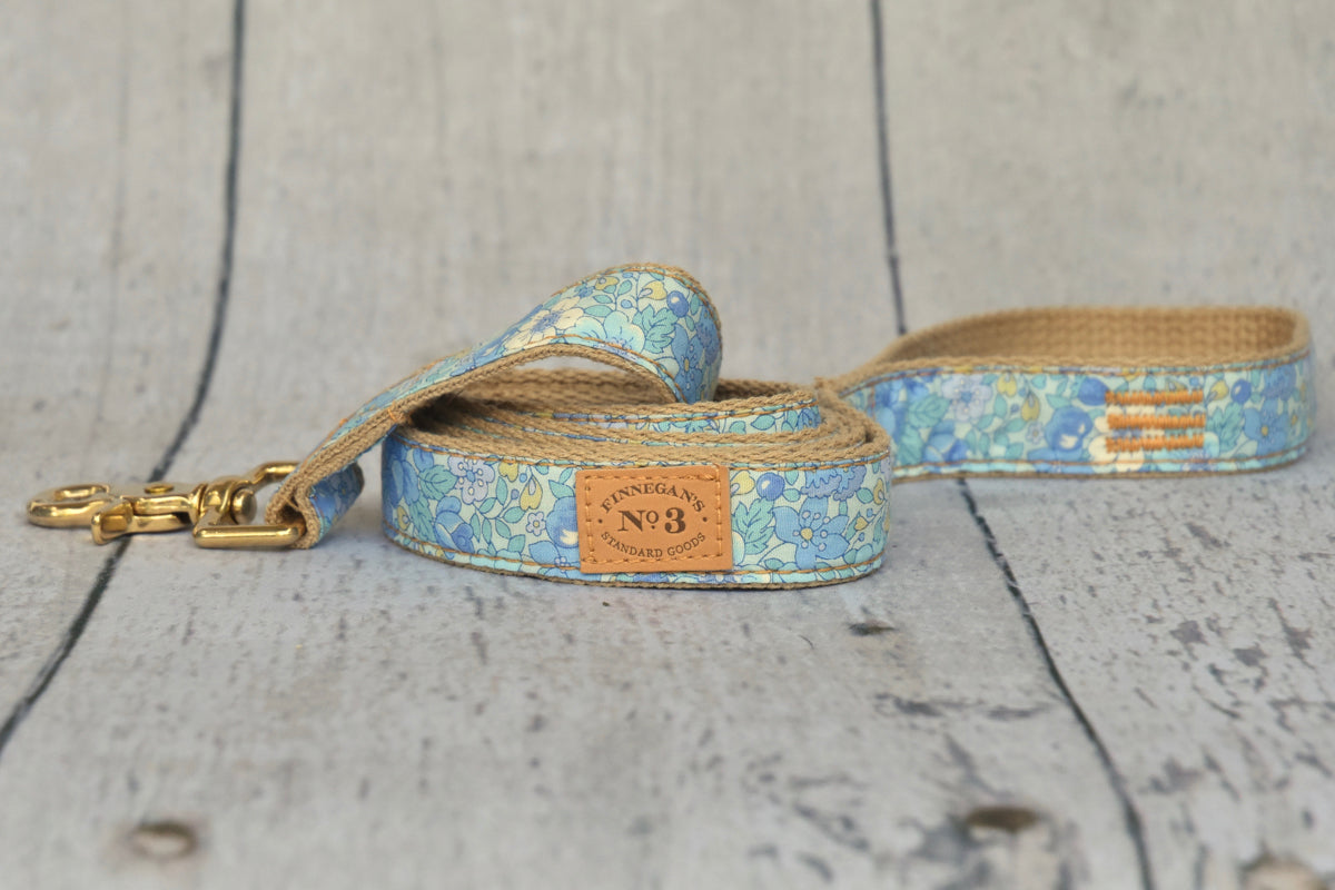 All of our accessories are made on lightweight soft cotton webbing. We use different fabrications, sourced from all over the world, accompanied by solid brass fittings and an adjustable collar. All of our products are handmade and assembled in San Francisco, California. Our 3/4 width collar is great for our smaller canine friends- or a larger breed puppy. Remember a matching leash because everyone loves to match! The small goes to an 11 inch neck and a medium to a 14 inch neck. – 5 foot leash