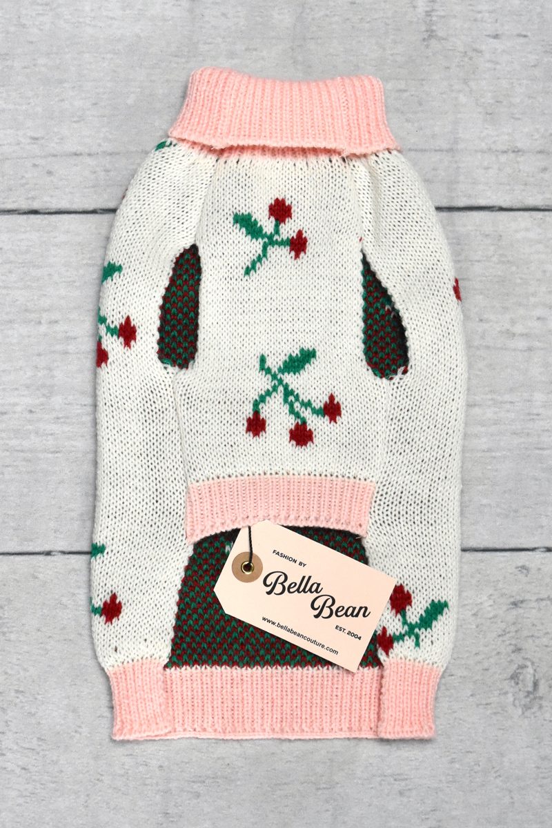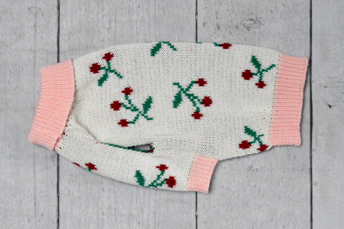 Limited Edition Bing Cherries Sweater- perfectly sweet! Simply measure your pup from their neck to the area in their back that you want the sweater to hit, then pick the corresponding size. The sweater is sleeveless and made of 100% polyester. This is a very forgiving style and works for a yorkie or a French bulldog and all the size pups in-between!